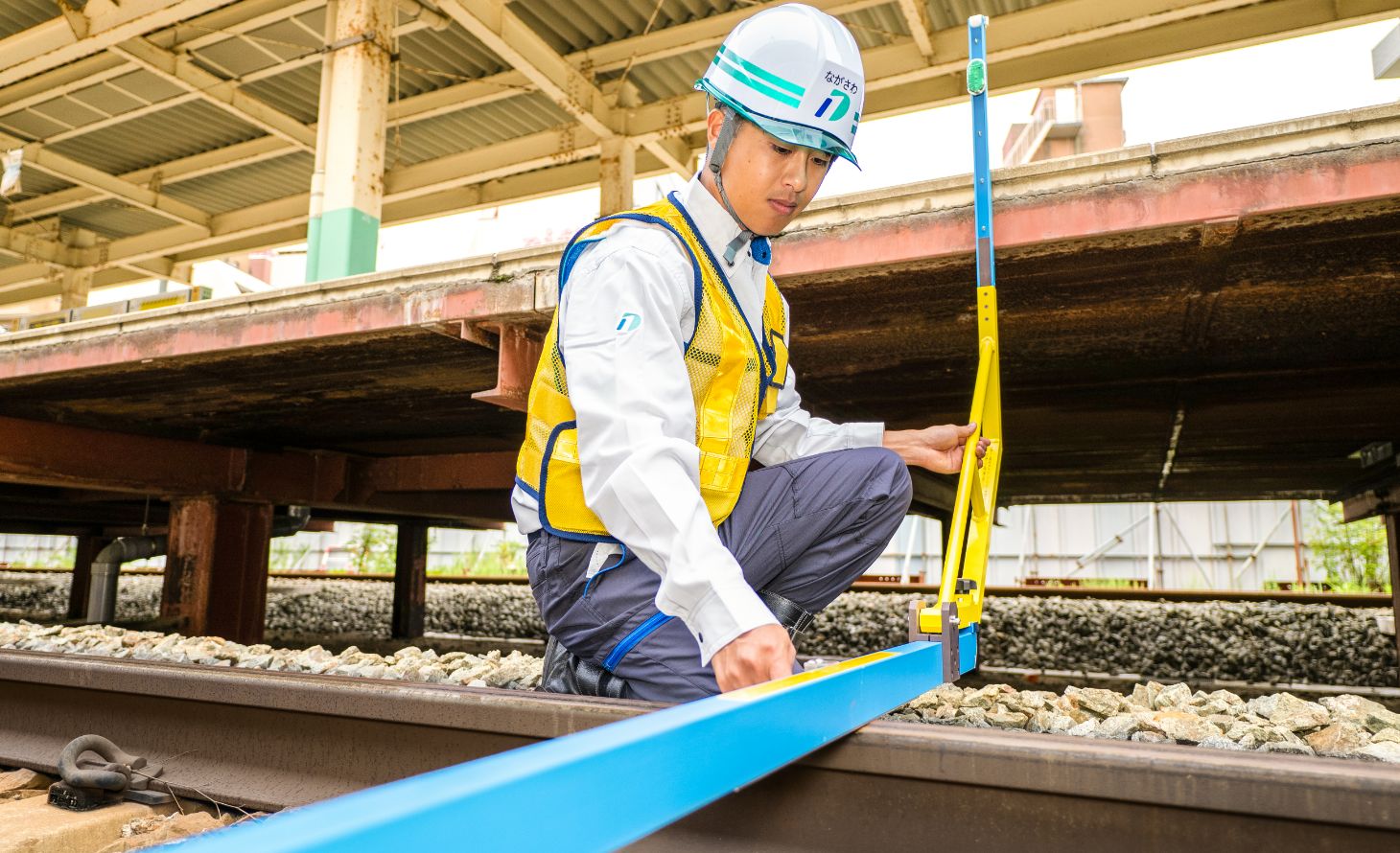 私は線路の検査業務、保守業務に従事しています。特に検査業務は線路の状態が良くない箇所を見つけて、線路の保守業務へとつなげる重要な仕事です。列車が走る線路の状態を「ミリ単位」で検測しなければなりません。また保守業務では、安全・品質・工程に神経を尖らせ、列車の安全・安定輸送に貢献しています。